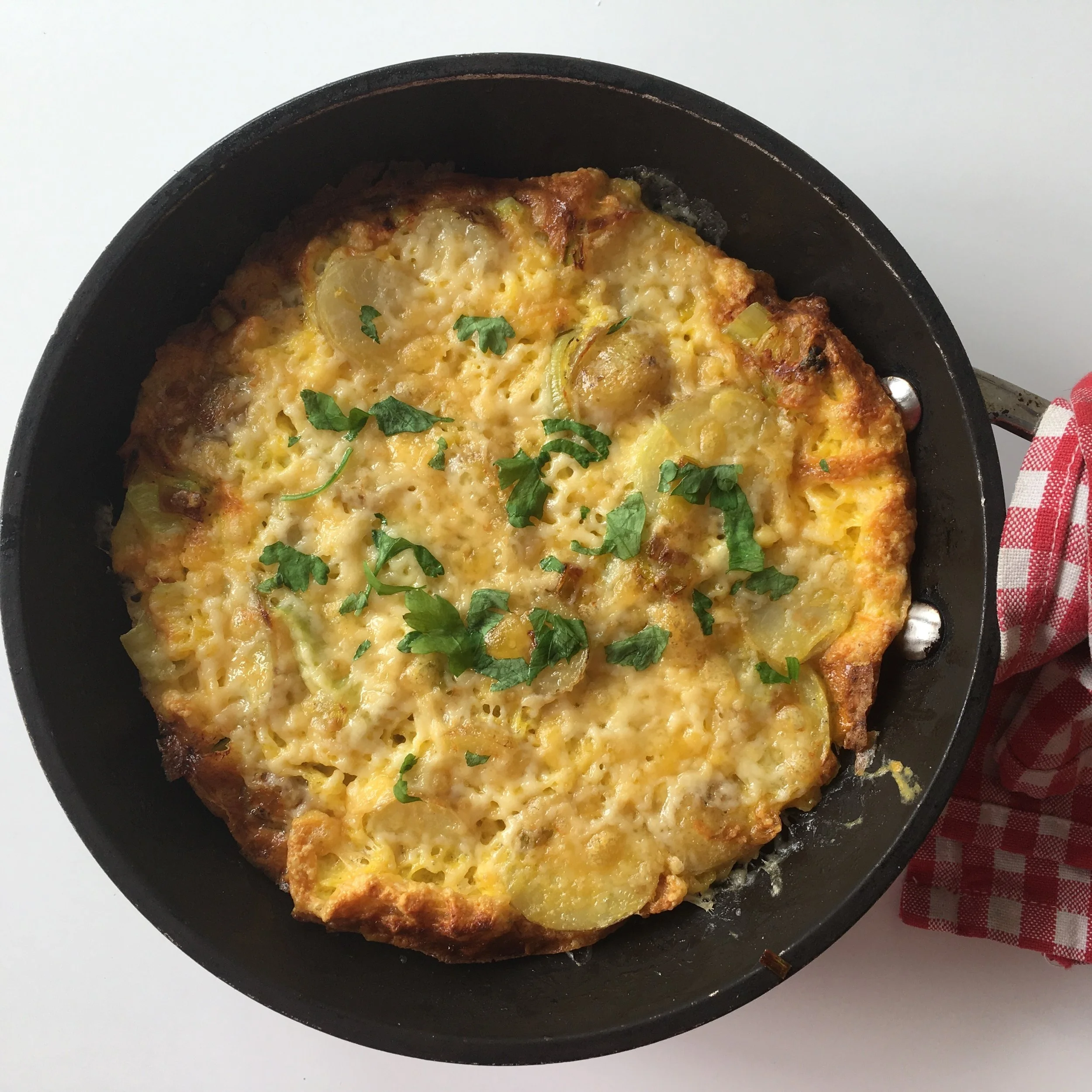 Heat up some veg oil in a small (very non-stick) frying pan. Use a medium to low heat to help stop things sticking. Once hot, pour over the cabbage mixture. Pour over any remaining batter to fill any obvious gaps.