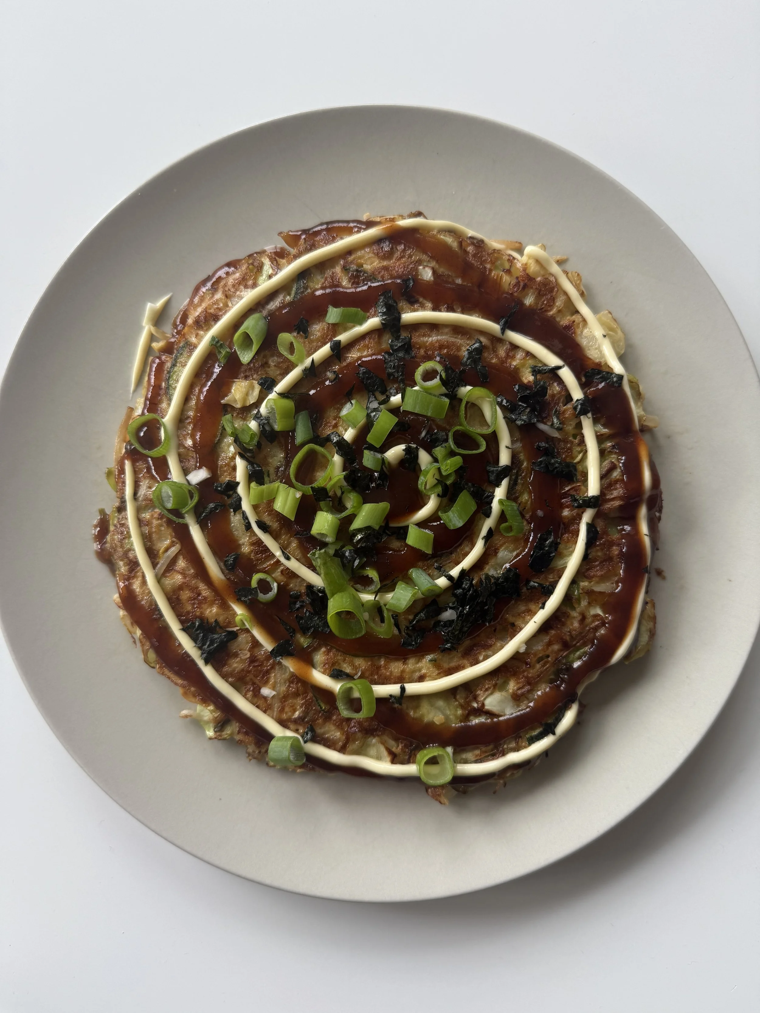 Cook for about another five minutes. Turn it out onto a serving plate. Decorate with entwined swirls of the okonomiyaki sauce and mayonnaise. Top with chopped nori, the rest of the spring onions and anything else you want, like pickled ginger, bonito (tuna flakes) or sesame seeds.